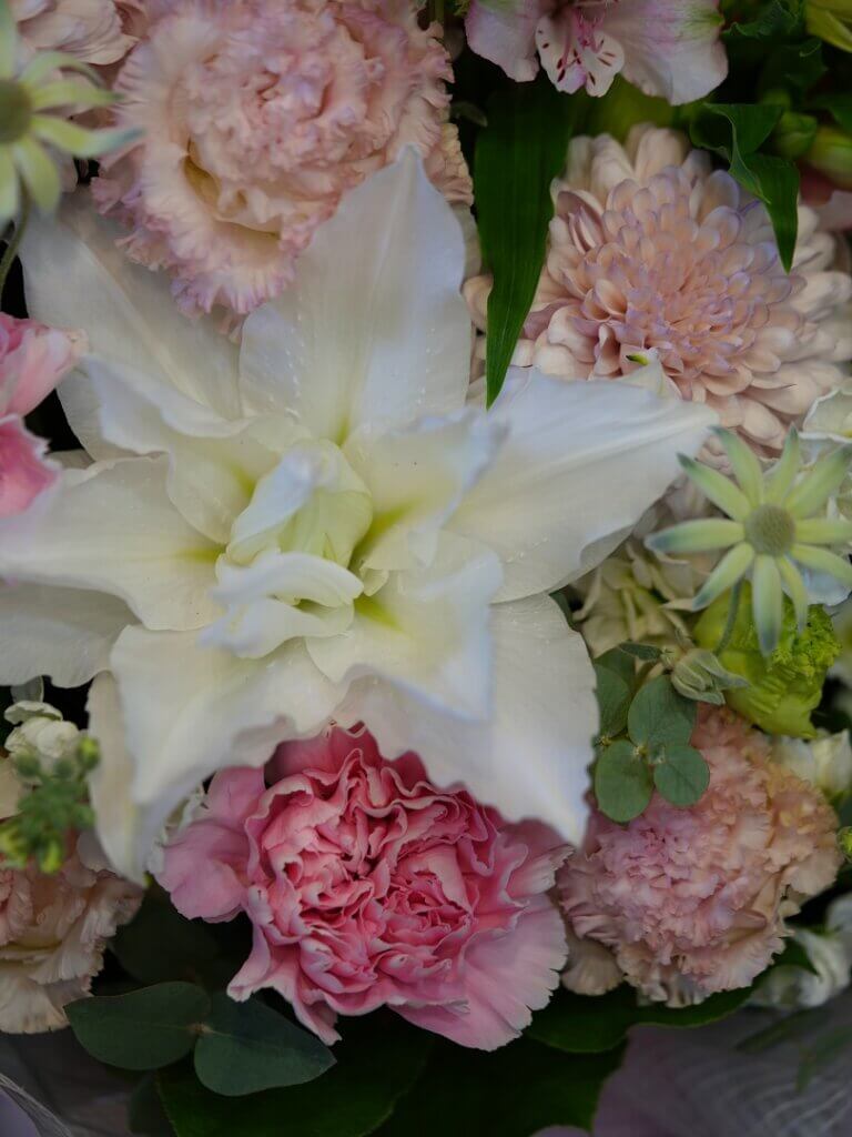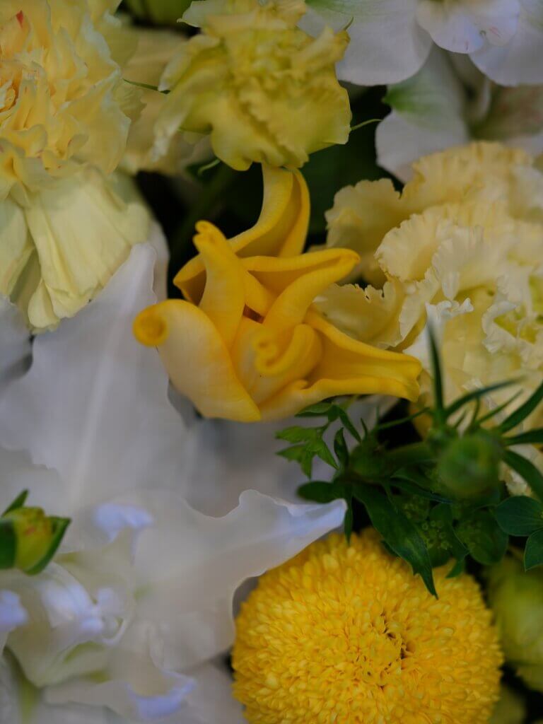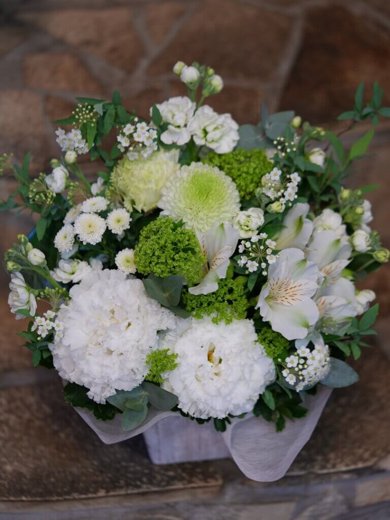 御供花は菊も使いつつ、洋花も入れています。